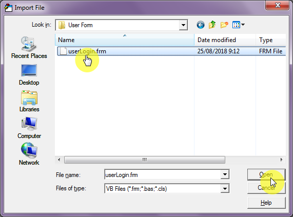 - Pilih UserForm yang berekstensi .frm yang tadi telah di export dan ingin di Import atau dimasukkan ke Project baru, kemudian klik Open